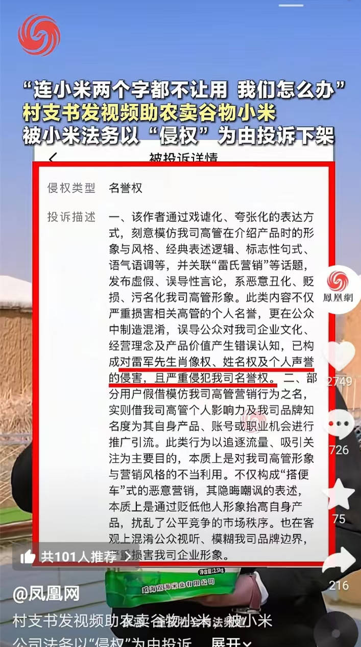 事务的起因,是冯玉宽为推广村里的金谷小米所采纳的特殊营销体例。为了正在浩繁农产物曲播中脱颖而出,他锐意复刻了小米公司的产物发布会场景,视频题目间接定为“金谷小米发布会”,时不只仿照雷军的语气腔调取肢体动做,还屡次利用“卑贱的品鉴官”等标记性话术,更自动联系关系“雷氏营销”话题标签。这种高度类似的仿照行为,被小米法务认定为涉嫌贬损高管抽象、对企业文化的认知,最终以“名望权”为由倡议赞扬,导致相关推广视频被下架。