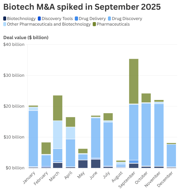 正在履历了岁首年月的低迷之后,2025年9月和10月,生物手艺行业的并购勾当显著回升。特朗普对昂扬药价的以及对制药行业征收三位数关税的逐步解除,加之利率周期的,进一步刺激了并采办卖。例如,辉瑞和诺和诺德(NVO。US)就Metsera及其领先的减肥候选药物展开的竞购和,充实展示了该行业某些细分范畴的合作之激烈,大型制药公司正竭力填补即将到来的收入缺口。而多种要素配合促成了生物科技并购的迸发式增加。现在,各公司面对着既要填补产物线空白,又要应对激烈合作以收购优良资产的场合排场。一些全球最畅销的药物反面临正在环节地域得到专利的风险,这被业内称为“专利悬崖”。据计较,到2032年,畅销品牌专利期的将形成至多1739亿美元的年发卖额丧失。若是将规模较小的品牌也考虑正在内,风险总收入的估量值则有所分歧,一些阐发师认为这一数字正在2000亿美元至3500亿美元之间。除非这些公司可以或许用新的、可以或许带来收入的立异产物弥补其研发管线,不然这将对它们的营收形成实正的。制药公司需要弥补其研发管线,而取此同时,正在履历了多年估值低迷之后,生物手艺行业正在新冠疫情期间医疗保健投资高潮的鞭策下,也起头苏醒。